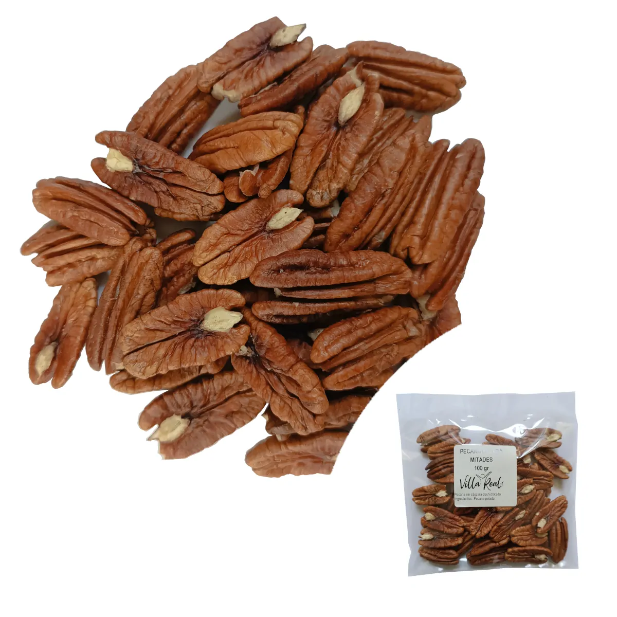 100 gramos de Pecana pelada en mitades, en bolsa Transparente sellada, Lista para consumir.